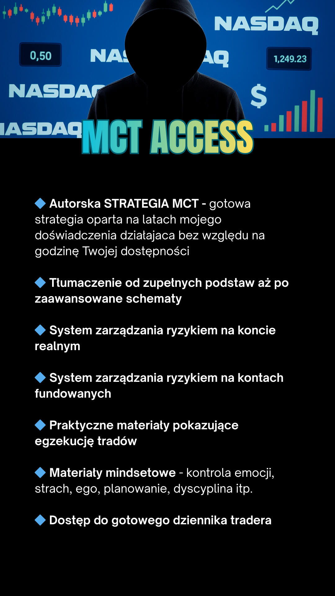 Dla osób wolących działać indywidualnie, swoim tempem. W MCT ACCESS poza gotową strategią, gotowym dziennikiem tradera i systemami zarządzania ryzykiem, znajdują się również materiały mindsetowe, w których przekazuję wnioski zebrane przez ponad 5 lat działania na rynkach, dopinają one wszystko na "ostatni guzik".